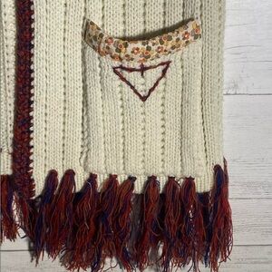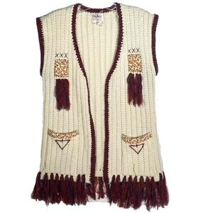 Vintage 70s Beige Knit Sweater Vest Women’s Medium Embroidered Fringe. Armpit to armpit 20”, shoulder to hem 26”, 30” to bottom hem.