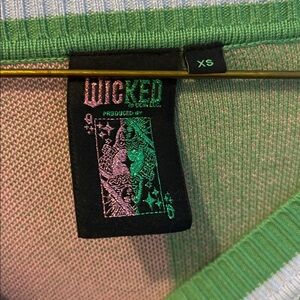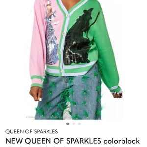 Celebrate the magic of "Wicked" with the Colorblock Glinda & Elphaba Button Up Cardigan by Queen of Sparkles. Featuring long sleeves and bejeweled buttons, this cardigan showcases vibrant Glinda Pink and Elphaba Green with full-sequin depictions of the beloved characters. With a graphic pattern and a flattering V-neck, the soft, elongated design is perfect for making a statement. Only worn once for the Wicked part two premiere. Size xs but fits small/medium