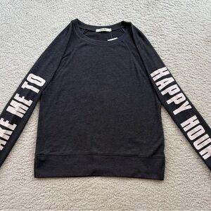 Soft gray knit top by Junk Food Los Angeles stating “TAKE ME TO HAPPY HOUR.” Features a classic design with raglan sleeves, banded collar, cuffs, & bottom edge and 3” side slits. The fabric has a soft and luxurious feel. It’s 48% cotton, 47% polyester, 5% spandex and is machine washable. Made in the U.S.A. Measurements are: Length = 21-1/2” and Pit-to-Pit = 20”. Size M.
