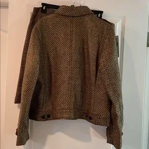Elegant brown tweed skirt and jacket perfect for any occasion.