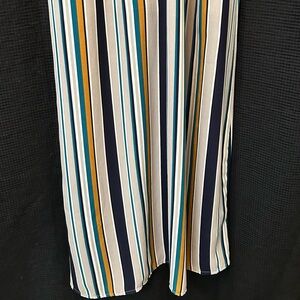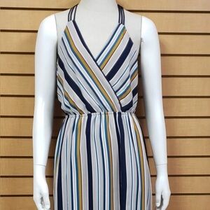 Beautiful Monteau Los Angeles sleeveless maxi dress in size Large. Features a flattering wrap-style V-neck bodice with an elastic waist and flowy full-length skirt. Eye-catching vertical stripe pattern in navy blue, cream, teal, and mustard yellow — perfect for spring, summer, vacations, or casual events.