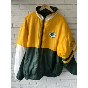 This vintage 90's Starter jacket is a rare find for any Green Bay Packers fan. Officially licensed by the National Football League, this jacket features the team's iconic green color and design. With a roll-up hood and a size 2XL, this jacket is perfect for the football season and is a must-have for any die-hard Packers supporter. Perfect for men who appreciate retro sports apparel, this jacket is a unique and stylish way to show off team pride.