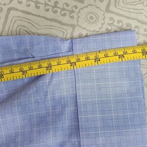 New without tags, Polo Ralph Lauren men's long sleeve lightweight 100% cotton shirt, marked size 16 1/2 34-35, equivalent to large. Light plaid checked pattern in darker blues and off-white cream, featuring the Polo logo on the chest. Flat lay measurements: chest 24", length 31", outer sleeve 25".