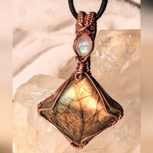 Ethereal Gemstone Pendant Necklace Natural Moonstone And Labradorite In Copper