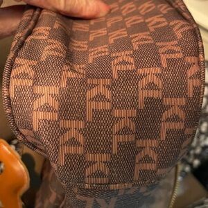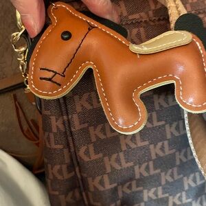 Chic shoulder bag with all-over KL monogram. Features a playful charm and sleek design. Ideal for daily wear. She is NWOT. She is 12 x 10 with out the flap open in the middle. She has a section in the back with a magnetic closure. Brown guitar strap. A pouch and 2 zippers on the front. Inside has 2 pouches and a zippered area which has the CL Italy. Please see pictures prior to purchase to determine the condition of the item. Item is sold as is, no cancellations or refund refunds. Please bid responsibly as all bids are binding per Poshmark. All sales are final.