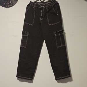 Dark cargo pants with bold contrasting stitching. Multiple pockets for utility. Perfect for everyday wear.