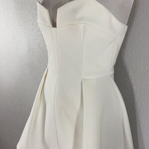 Keepsake the Label Divide off white ivory strapless dress. Lined. Zipper back. Notch neckline. Polyester spandex, has stretch. From underarm to hem approx 23 inches long. Size XS