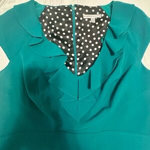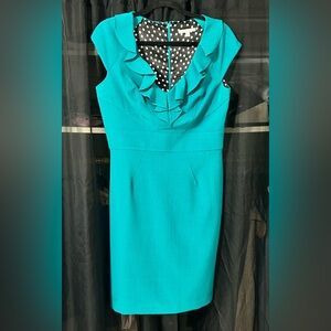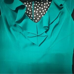 Elegant Sandra Darren sheath dress in a beautiful teal color. Features a flattering V-neckline with layered ruffle detail and a classic sleeveless silhouette. Fully lined with a playful black and white polka dot interior and finished with a back zipper for easy wear.
