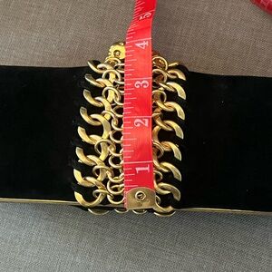 Elegant black clutch featuring striking gold chain detail. Perfect for evening events. Gently loved. Imperfections pictured. Measurements pictured.