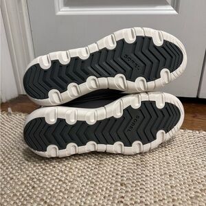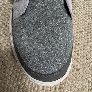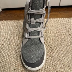 Sorel boots with a light gray upper and dark gray accents. Never worn! Durable and stylish for everyday use. Please note the sparkle accent on the toe vamp.
