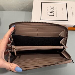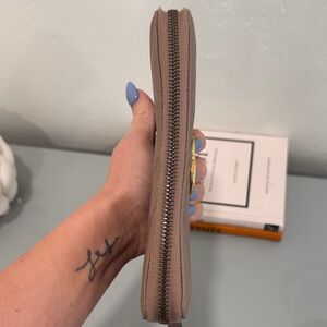 Chic Gucci wallet in beige. Features iconic gold logo. Stylish and functional.EUC.