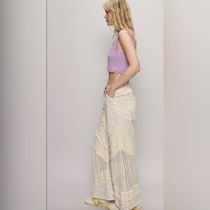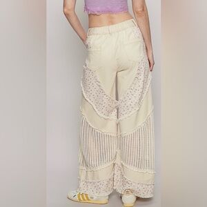 Stylish wide leg jeans with floral and crochet details. Cream color with unique design. Perfect for a chic look.