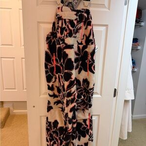 Cozy jumpsuit with bold black and pink floral design. Perfect for a stylish and comfortable look.