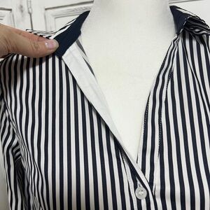 Fitted shirt in woven stretch fabric with shaping darts at front and back. Open collar front, buttons at the front and at the end of sleeves and cuffs. Gently rounded hem.