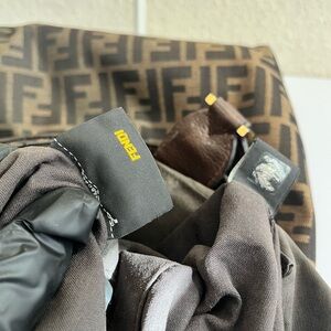 Interior is lined with fabric, has two slip pockets with the brand logo.
