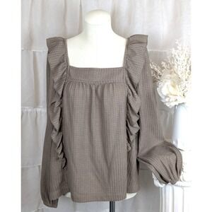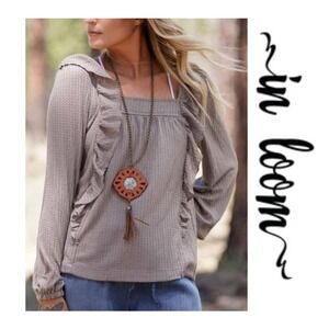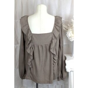 In Loom Taupe Waffle Knit Ruffle Long Sleeve Top Size M