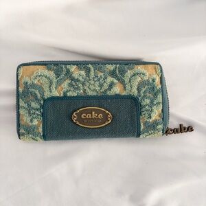 Stylish zip-around wallet by Cake by Petunia featuring a textured teal floral tapestry exterior and signature logo plaque. Functional and well-designed with ample interior storage and smooth zipper closure.