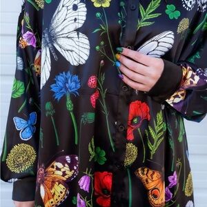 Vibrant floral + butterfly print. Long sleeves. Button-up front w/ exaggerated collar. Perfect for any occasion. Silky soft. Shorter in the front than the back. Absolutely adore! Worn once