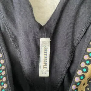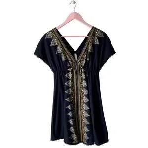 Black short sleeve 100% cotton v-neck mini dress by Free People with an abstract print at the neckline and down the front. Great preowned condition. Size small. Measurements in photos.