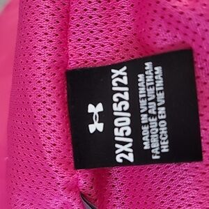 Stylish pink windbreaker jacket by Under Armour. Features a hood and front zipper.