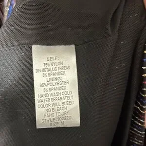Material: shell- 70% nylon, 20% metallic thread, 5% spandex