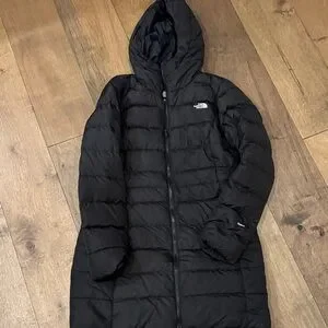 Cozy and stylish black puffer. Ideal for cold weather. Features a hood for extra warmth.