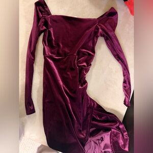Luxurious velvet dress with long sleeves. Rich burgundy color. Elegant and stylish design.
