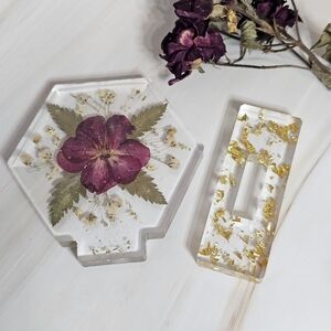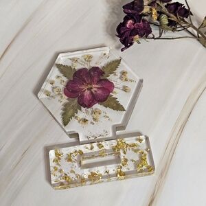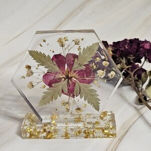 Beautiful handmade hexagonal resin display featuring a flowers and gold accents. Perfect for home decor.