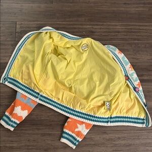 Vibrant cardigan with star patterns and playful designs. Features a mix of blue, orange, and yellow colors. Size 2 (medium) fully lined, brand new never worn