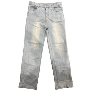 These are a pair of light blue straight-leg jeans, size M. The jeans feature a classic five-pocket design with a zipper fly and button closure. They have a light wash