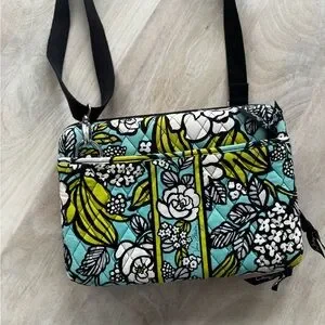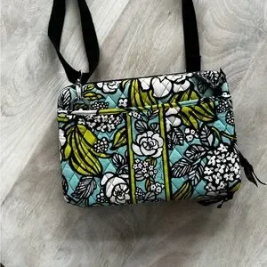 Stylish Vera Bradley laptop bag. Features vibrant floral pattern. Includes adjustable black strap. Perfect for carrying essentials.