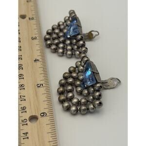 Beautiful vintage 1970s clip earrings featuring faceted blue glass stones with draped strands of silver-tone metal beads. The triangular stones catch the light while the layered beadwork adds depth.