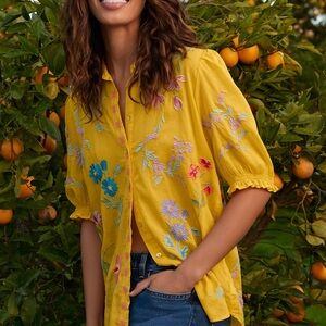 * Johnny Was Workshop Evangeline Smocked Lisbon Shirt W18624-3S --- Crafted from 100% breathable cotton, the Evangeline Smocked Lisbon Shirt is bold in color and brilliantly adorned with intricate placement embroidery. Featuring a traditional collared button-front and shirred sleeve cuffs, this lightweight blouse is finished with a gently curved hemline.