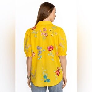 Johnny Was Evangeline Smocked Lisbon Shirt Embroidered Blouse Puff Sleeve Size S