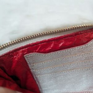 Stylish metallic wristlet with zipper detail. Perfect for any occasion. Compact and elegant design.