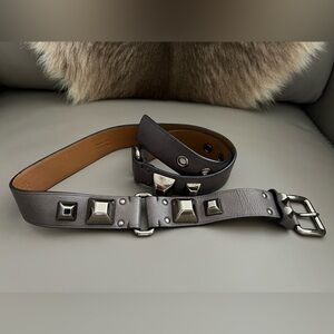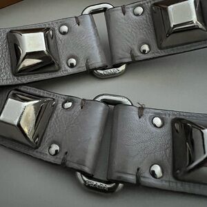 Prada gray leather belt featuring a sleek silver buckle with bold stud detailing, perfect for adding a touch of sophistication to any outfit.