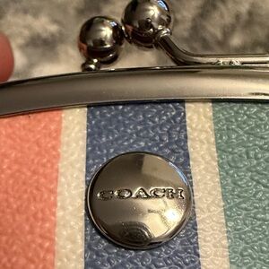Vibrant Coach vintage coin purse with bold stripes. Features a secure kisslock and compact design. Ideal for a chic accessory. In good condition.