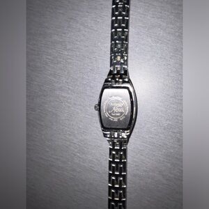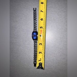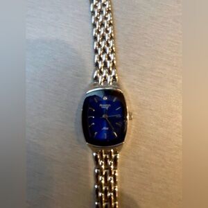 This Armitron Diamond watch features a silver braided plated design, blue face with analog clock, hands, second hand, and silver hour non numeric marks. It has a clasp closure, but is currently not working and would require a new battery. The watch is of lighter weight, with approximate measurements provided in the pictures. The front and back of the watch are pictured, along with multiple other images. It is EUC and suitable for ladies.