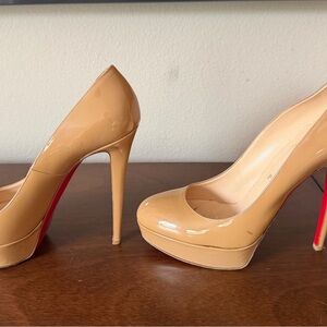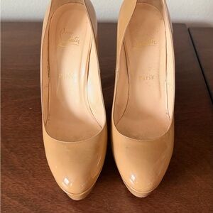 Chic and timeless Christian Louboutin heels. Nude patent leather with iconic red sole. Perfect for any elegant occasion. No box. No dust bag.
