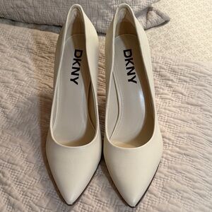Chic DKNY heels in a sleek light cream shade. Perfect for elevating any outfit. Excellent condition. Size 9. From a smoke free home.
