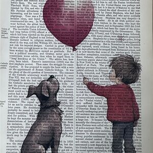 Whimsical Child and Dog with Balloon Art Print on VINTAGE ENCYCLOPEDIA BOOK PAGE