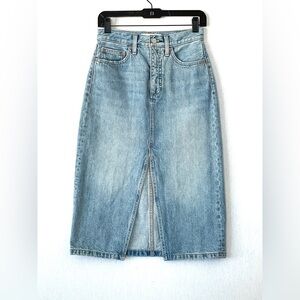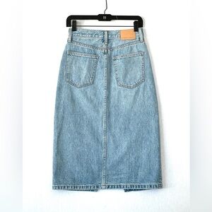 Inspired by the alluring attitude of the '90s, The Halle is Denim Forum's streamlined midi skirt, complete with a front slit and felled out seam. It's cut from premium Italian cotton denim with a hint of stretch, and it only gets better with wear — good thing you'll wear this a lot. This version comes in a light medium indigo wash and is made with regenerative cotton certified by regenagri®. We make a great pair.
