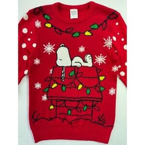 Keywords: Christmas sweater, Snoopy, Peanuts, Ugly Christmas sweater, Holiday sweater, Winter knit, Festive apparel, Character sweater, Red sweater, Polka dot pattern, Snowflake design, Licensed merchandise