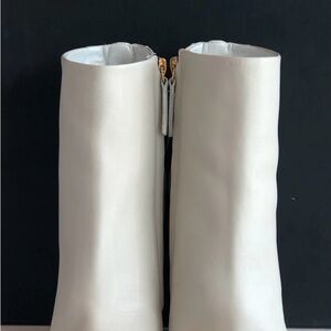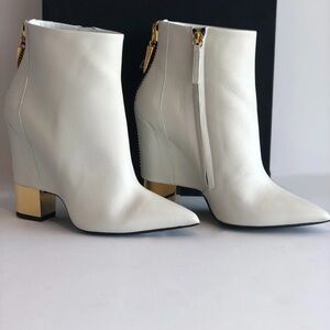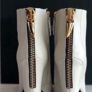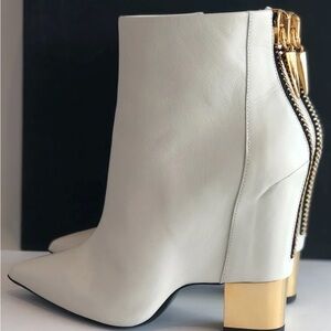 Stunning white leather Giuseppe Zanotti pointed-toe ankle boots with shark tooth zip accent at the back and a gold accent heel. Gold-tone hardware, covered and resin heels and zip closures at insteps. Includes dust bag.