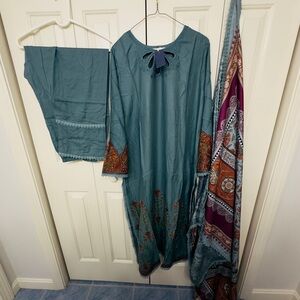 Teal and Purple Embroidered Salwaar Kameez and woolen shawl in size 24”