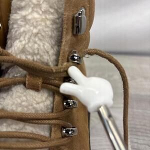 Features: Lace-up closure, metallic eyelets, padded collar, and faux shearling detail.