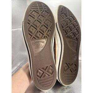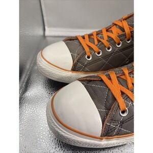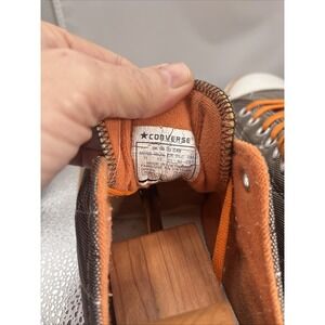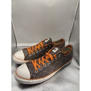 The Vintage Converse All Stars Men's Quilted Canvas Greyish Sneakers in size 11 are a stylish and comfortable choice for casual or activewear. Featuring a colorblock pattern with a brown-gray and orange color scheme, these lace-up sneakers are made of durable canvas lining and rubber outsole. The classic Converse brand and iconic Chuck Taylor All Star model make these sneakers a timeless addition to any wardrobe. Perfect for those looking for a colorful and comfortable sneaker option with a vintage flair.