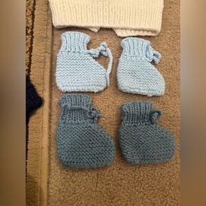 Adorable baby knit set including a green sweater, cream hoodie, navy sweater, and blue striped pants with matching booties. There are no tags but they fit sizes ranging from 6-12 months. The shoes are untied but everything else is in excellent shape!