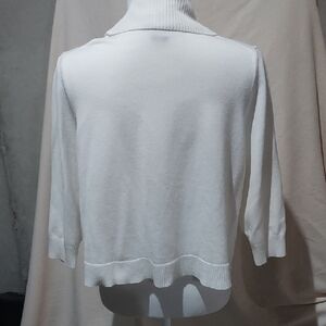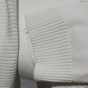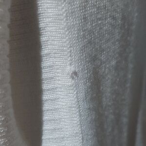 This elegant white open front cardigan is perfect for layering. Its soft texture and classic design provide both comfort and style. This is more of a crop and not full length. 2 small snags see photos. Very cute and stylish.