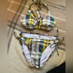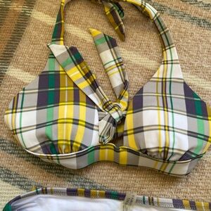 Stylish bikini with a plaid pattern. Features purple, green, and tan hues. Xs most fits S